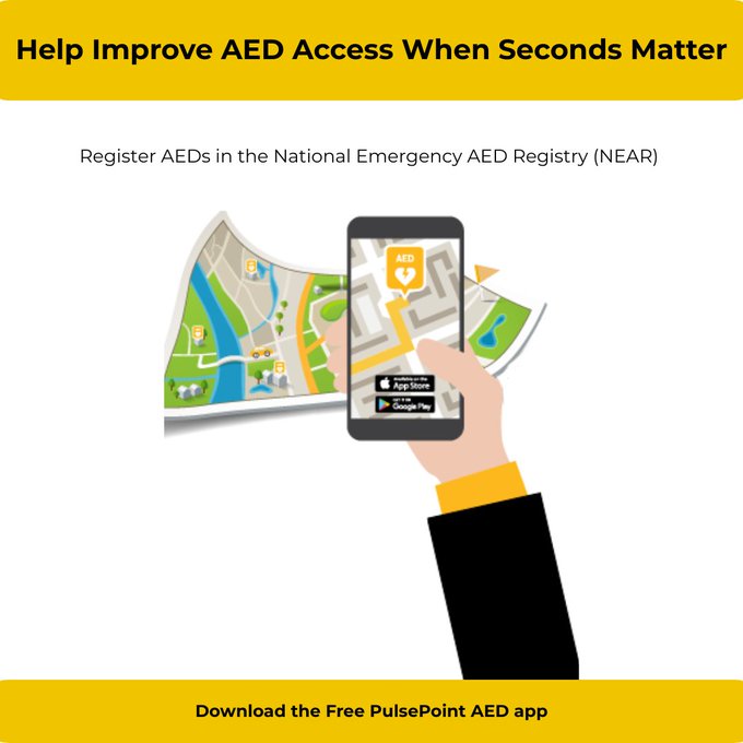 @PHWorg AEDs save lives — but only if people know where they are. Registering AEDs in the National Emergency AED Registry (NEAR) helps ensure locations are available to 911 dispatchers & public safety apps. 📲 Download free PulsePoint AED app: 👉 https://t.co/6VYzIhTjSr @pupulsepoint.org/pulsepoint-aedYzIhTjSr @pulhT92q30Z